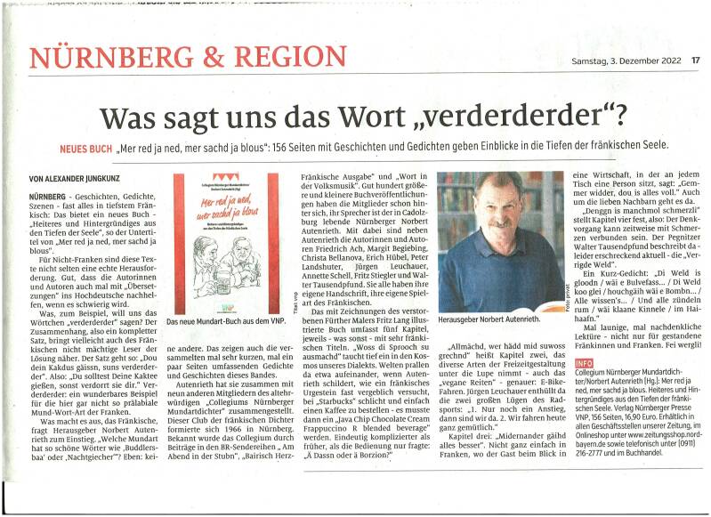 Ja, tief schürfen sie, die zehn Autorinnen und Autoren des „Collegiums Nürnberger Mundartdichter“, einer Künstler-vereinigung, die sich seit über 50 Jahren um die Mundartpoesie mit Erfolg bemüht.